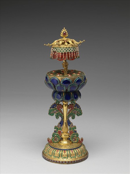 蓮座托承華蓋供具,為八吉祥工具之一。以紅、綠玻璃製為幢帷,表面模製垂縐紋,邊緣凹凸起伏,猶如懸垂織物。據《活計檔》記載,乾隆年間粵海關曾一次呈進七珍八寶元光用玻璃九十塊,造辦處奉旨將七珍八寶持出成作,可知清代宮廷以各色玻璃作為裝陳物件之鑲嵌材料,形式多元,來源不一。