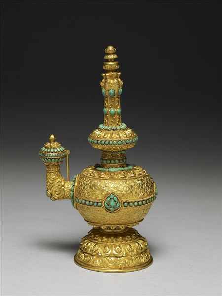 奔巴壺也作「賁巴壺」,是藏語「瓶」的意思,壺為圓腹,一側附流口,長頸,壺口有蓋,無把手或柄,盛裝淨水,灌頂、沐佛等法會時用。這件金嵌松石奔巴壺分段鑄造銲接而成型,表面運用敲花、纍絲等技法,並鑲嵌綠松石。全器以番蓮紋為主,足、腹及頸上下緣飾蓮瓣紋,器底刻十字杵紋,杵心雕作寶相花,做工精細,色澤華麗。