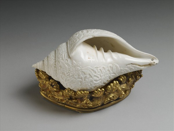 白色左旋七層螺貝,頂端兩層另加黏接,器表滿佈淺浮雕纏枝番蓮紋,口部淺陰刻隸書款:「乾隆敬製」。帶銅鍍金座,如波濤洶湧之狀,座底中央飾一鏤空古錢紋。有清一代對於海螺一直有特殊的喜好,女真(滿)族人還在關外時期即從蒙古族傳入海螺的使用,當時的海螺使用範疇相當廣泛,在後金建國之前,它是一種原始軍令工具,以號令和鼓舞士兵衝鋒,並在心理上給交戰敵方造成威攝;它也是報警和集兵工具。在後金建國之後,海螺進而是國事活動的儀仗之一,也是當時的「禮樂之器」。定鼎中原之後,海螺逐漸退出國家戰爭與政治活動,而僅作為軍隊操演和皇帝大閱的軍樂器,乾隆二十四年(1759)修成的《皇朝禮器圖式》中稱海螺為「海蠡」,並明訂其使用範圍。雖然如此,入關後清帝對於海螺的喜愛並未稍減,但主要是與宗教相關連,清高宗即曾撰「法螺贊」,認為這種「梵天之器」是「以演大乘,溥歸佛旨」。海螺是佛家八寶之一,紫禁城內或各地行宮的佛堂皆須陳設,這件海螺則是行宮中的佛堂陳設器,或陳設於熱河行宮,或陳設於瀋陽故宮。