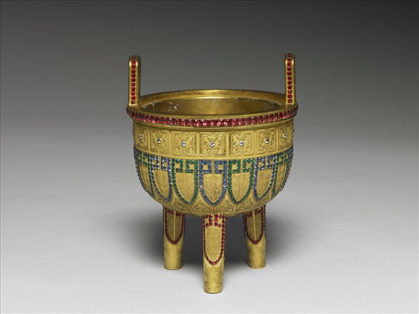 銅鍍金爐, 圓口,深壁,圓底,雙立耳,三足。以鑄造、敲花及鑲嵌為飾,腹部由上至下飾卷葉紋,蟬紋,卷葉紋,足部飾蟬紋及回紋,蟬紋是以藍、綠方形玻璃鑲嵌框邊,內飾回紋,口沿及立耳亦鑲嵌紅色玻璃。