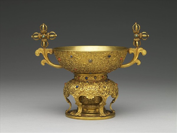 足底刻「乾隆年製」款。清宮作品,乾隆時期。高足碗放置在几狀托內。碗的雙耳呈卷葉狀向上托起十字杵。碗與托之外壁均浮雕番蓮花,卷枝細密,鏨珍珠地,鍍金沈厚,並嵌松綠石﹑青金石﹑珊瑚。碗足底鏤錢紋,並刻乾隆款。