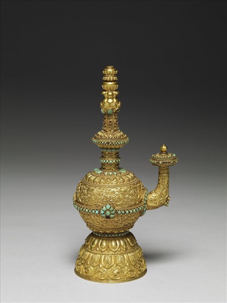 鍍金嵌松石奔巴壺,為盛裝淨水之用。通體外壁為鑄造、敲花、纍絲、銲接、鍍金、鑲嵌等並陳的金屬工藝,以腹部敲花轉枝番蓮為主紋,餘為卷草、蓮瓣等紋。製作精緻,間圍以切割齊整的松綠石,益襯托鍍金的光澤明麗。底刻十字杵紋,杵心雕作寶相花。