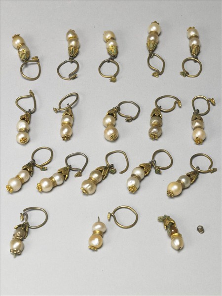 中雜69~77,珍珠耳墜,圓形圈環,端點飾點翠如意紋,纍絲點翠葉形寶蓋下,墜部串珍珠二,中間隔以金環或纍絲金花,尾部飾纍絲金花,其中一件串一紅色玻璃與一珍珠。本文物統一編號為照片中的其中二個耳墜。