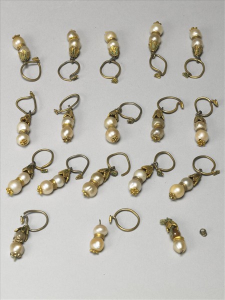 中雜69~77,珍珠耳墜,圓形圈環,端點飾點翠如意紋,纍絲點翠葉形寶蓋下,墜部串珍珠二,中間隔以金環或纍絲金花,尾部飾纍絲金花,其中一件串一紅色玻璃與一珍珠。本文物統一編號為照片中的其中二個耳墜。