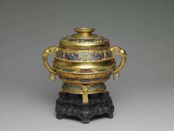 圓口,雙耳,鼓腹,凹底,帶三幾何形足。帶圓頂蓋,圈足鈕。口緣飾紅色料石鑲嵌而成之連珠紋,腹中段飾兩微凹寬弦紋,腹面餘地為回紋錦,錦地上鑲嵌紅、綠、藍各色料石製成之鳳紋與異獸紋。底座周邊鑲寶藍色料石之幾何紋與紅、綠料石之連珠紋,並飾三獸首。三足表面陰刻回紋。蓋面為回紋錦,錦上鑲嵌藍、綠料石之鳳與異獸紋。鈕頂飾一對鳳紋。附木座。