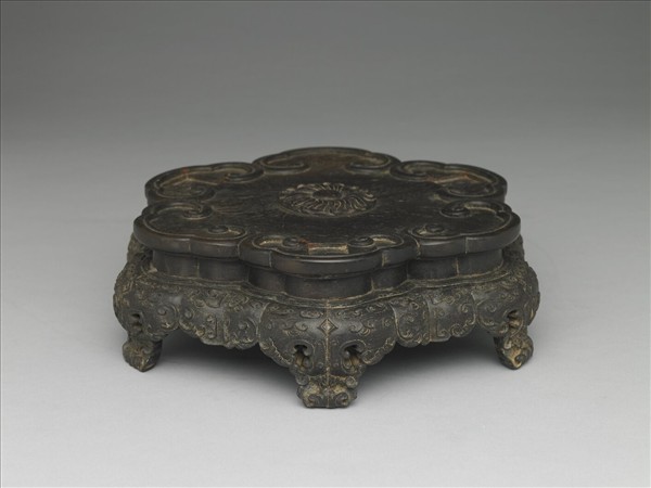 深棕色六瓣花形木座,底帶六矮足。木座上層周邊浮雕六如意雲紋,中心雕一花卉。三相互間隔之雲紋中心皆有一方形凹槽,可放置仿古銅金鳳紋墩之足。座側邊雕刻幾何紋與卷葉紋。