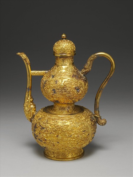 銅胎鎏金,葫蘆型壺身,S形把,微弧流,圈足,帶圓頂蓮苞鈕子母口蓋,壺與流間有一橫桿。全器以鑄刻製作紋飾,器身飾雲地雙龍搶珠紋,蓋飾番蓮紋,圈足飾福山壽海,流底部有一龍首,流如從龍口中吐出一般,口沿處飾雲紋及連珠紋,把兩端分飾龍首與龍尾。