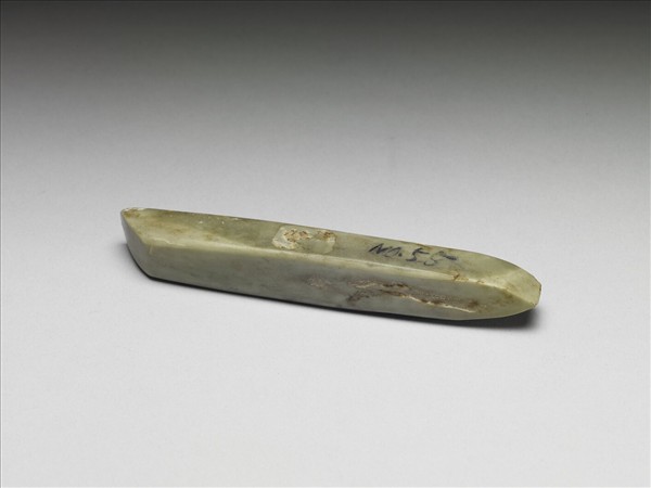 青綠夾雜乳白色石鑿,呈四方柱狀,平刃,偏鋒,器身起段處明顯。四面拋磨光滑,切割平整,尾端朝中央削尖。兩面墨書「NO.55」。