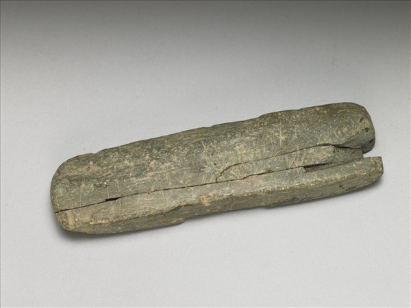 灰褐色石鑿,器身呈長方扁平形,刃面呈微弧形狀,偏鋒。石鑿尾端平直,帶一方形凹槽。器身多處帶裂痕,刃面與石鑿身帶多處凹痕。墨書「NO.51」
