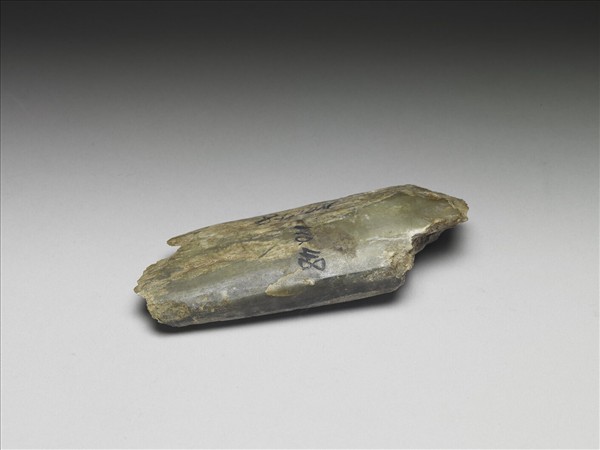 灰綠色石刀,刀身為扁平長條狀,器體略厚,表面拋磨光滑。兩側均打磨平直,前、後端已殘斷。一面墨書「NO.48」。