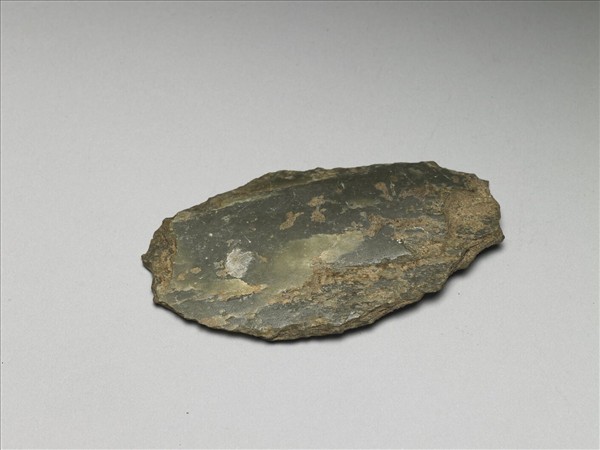 灰綠色石刀,刀身為不規則扁平形。全器周邊殘缺,刀身一面光滑平整,另一面凹凸不平。