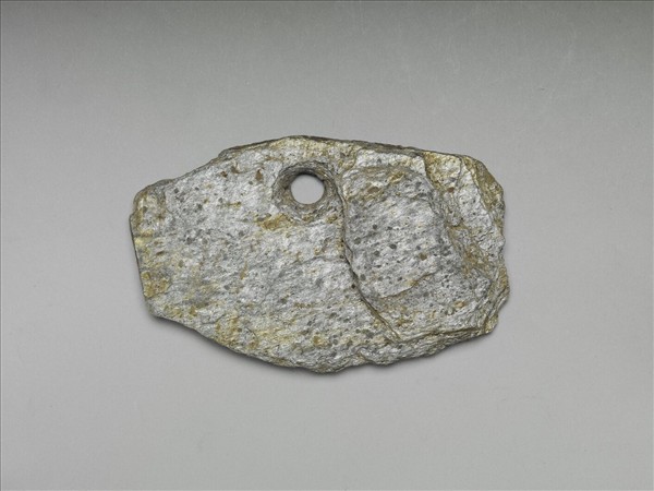 銀灰色石刀,器身呈不規則扁平形,弧形頂。刀上端帶一單面鑿穿之圓形孔,可見明顯穿鑿痕跡。刀身雙面均平坦,刃部已殘斷。