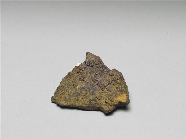 鐵製器物殘件,呈扁平片狀,一面微隆。全器嚴重鏽蝕,表面凹凸不平,其餘部分俱殘。