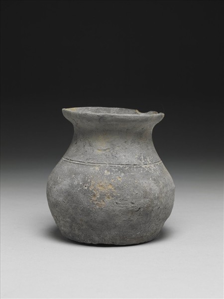 灰色陶罐,撇口,束頸,鼓腹,平底。口緣處略有殘缺,不甚平整,肩部陰刻一道弦紋。