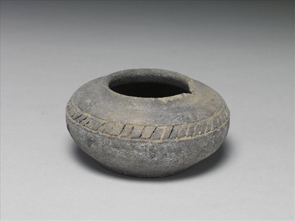灰色陶敦,圓口,鼓腹,平底。肩處帶兩道陰刻弦紋,弦紋間刻畫平行斜線。
