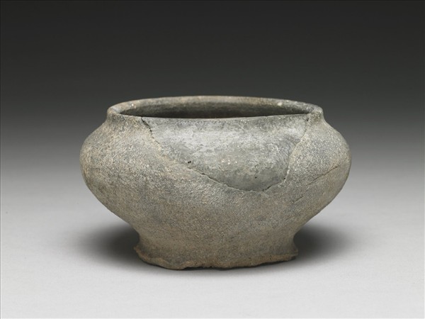 橙灰色陶瓿,圓直口,斜肩,鼓腹下斂,撇足。全器表面平素無紋。足不甚平整,全器曾破裂經修復。