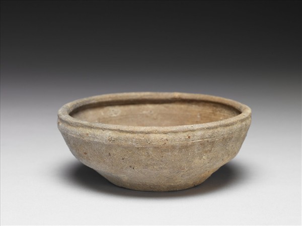 淺灰色陶碗,捲口,深斜壁,璧身於中段向內折,圓形平底。器身素面無紋。