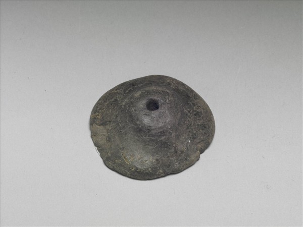 黑色紡輪為單錐體形,一面平,一面作錐狀突起,中間帶有一圓穿孔。器表不甚平整,邊緣略殘。