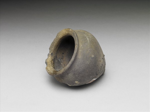 淺灰色陶罐,撇口,微弧璧內斂,罐底呈尖錐形,底部帶殘留陶土。全器素面無紋,口緣處略殘。