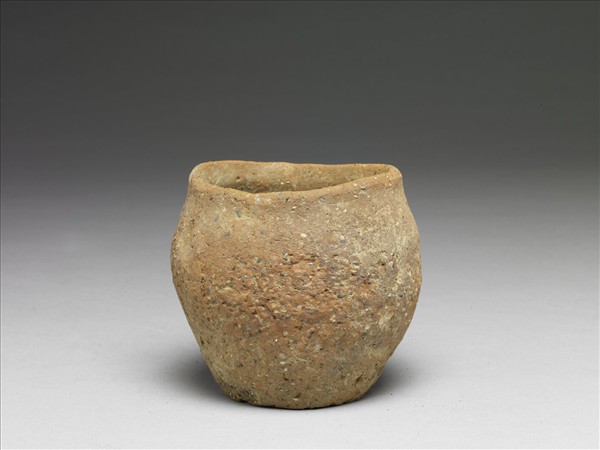 橙白色陶罐,直口,腹微鼓,平底。口緣不甚平整,全器素面無紋,夾砂。