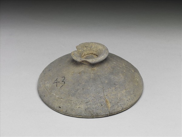 淺灰色圓頂蓋,帶外撇圈足鈕,唇口。全器素面無紋,器身破裂經修補。