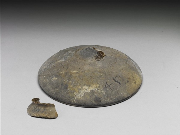 淺灰色圓頂蓋,帶外撇圈足鈕,唇口。全器素面無紋。