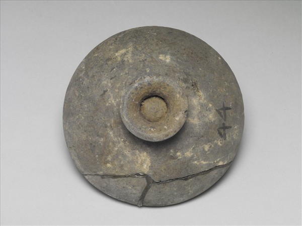 灰色圓頂蓋,帶外撇圈足鈕,唇口。全器素面無紋。鈕與蓋邊緣俱殘。