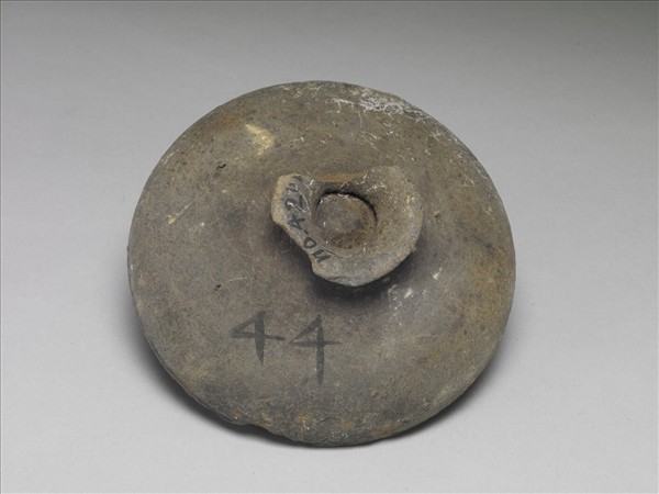 灰色圓頂蓋,帶外撇圈足鈕,唇口。全器素面無紋。鈕與蓋邊緣俱殘。