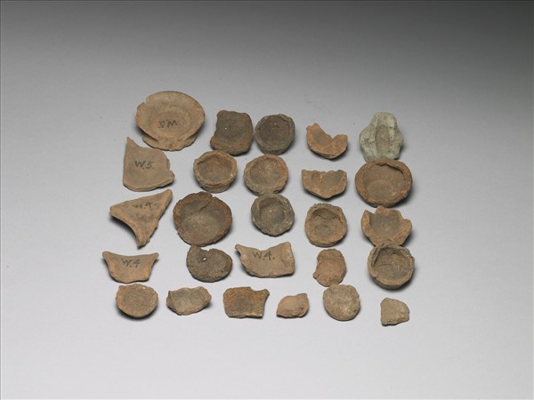 多件深淺不一之橙灰色陶器殘件,為陶器器身、器底與圈足等不同部位殘片,數件表面印有紋飾。