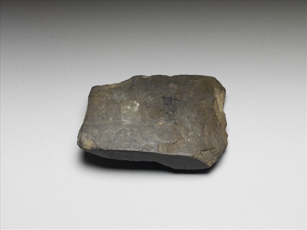 黑褐色石斧,頂窄而刃部稍寬,雙側切割平直。器體略厚,一面拋磨光滑,另一面多處帶剝蝕痕跡。雙面均墨書「NO.54」。