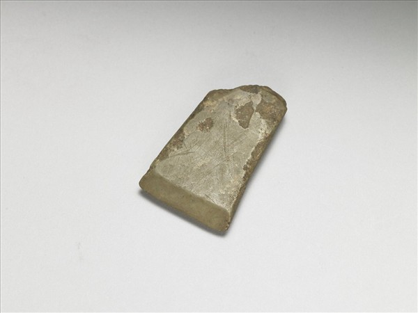 褐黃色石斧,頂窄而刃部寬,雙側邊緣平直,向下微敞,單面直刃。器身扁平,雙面均拋磨光滑。斧身上段已殘。墨書「NO.47」。