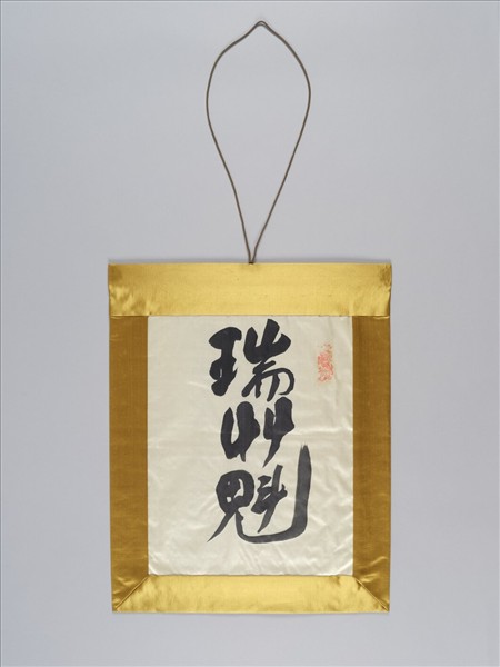 四邊飾金布條的白絹布茶旗共兩面。一般為標示茶席,懸掛的旗子稱茶旗。 瑞草魁是茶的美稱,唐代杜牧的《茶山》詩中「茶名瑞草魁」詩句。茶旗右上鈐印,是魁星的星神,左手持筆,左腳上踢,頭頂北斗七星,是魁星神像。旗背癸亥七月即大正十二年(1923年),鉄斎虛歲八十八歲的米壽年。