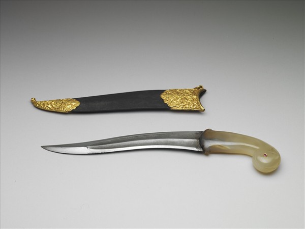 印度 蒙兀兒王朝 玉髓柄鑲金嵌寶金箔鞘短劍