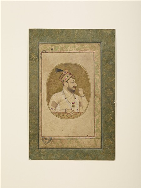 此件印度繪畫裱於深綠色厚紙上,邊緣飾以金彩花草紋,內以橢圓形為實際繪畫的外框。畫框內作側臉男子半身像,經與其他圖像比對,判斷所描繪的對象應為阿里艾迪沙二世(Ali Adil Shah II, r.1656-1672)。畫中阿里艾迪沙二世上半身微幅轉向左側,右手搭於飾有花紋的平台上,左手持長管物(研判應為水煙吸管)。整幅圖像以褐色為主要色調,映稱出裝點於頭頂、頸、手臂、手腕及手指的紅綠寶石。