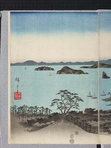 此件為歌川廣重於1857年完成,以雪、月、花為主題設計的《雪月花》三聯畫作之一〈武陽金澤八勝夜景〉,以全景式的構圖展現,描繪海岸旁的中秋月夜。 廣重以保永堂版《東海道五十三次》系列版畫成為日本浮世繪畫界閃亮的新星,此組雪月花可視為其告別藝壇的謝幕之作。