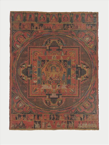 此幅財續母曼荼羅繪畫(paubha)。主尊1面6臂,右手分別作無畏印(代表事業成就)、持寶珠串(財源廣進)、作予願印(滿足願望),左手分別持《般若經》(空性智慧)、稻穗(財富俱足)、長壽寶瓶(清靜長壽);坐舒坐姿。 這種1面6臂的傳承的財續母雖然因被印度晚期密法大師無畏生護(Abhayakaragupta)編纂入《金剛鬘》(Vajravali)法集而傳入過西藏,但從現存美術遺品而論,此種傳承的財續母在西藏幾乎不流行;現存此傳承的作品,無論雕像或繪畫,都是尼泊爾之作品。 此幅具有方格狀構圖、以紅底為主要底色、捲草文暗花等典型尼泊爾早期唐卡(16世紀以前)的元素,構圖上中央主題、上欄相關尊像、格狀佛教故事、下欄供養人等也俱全,細部的風格比對可將此件定為14世紀的作品。