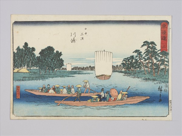 《東海道五十三次》是浮世繪三傑之一是歌川廣重作品,以東海道起點和終點加上五十三個宿場特色的風景為主題,共五十五幅版畫作品,後人評價較出色的版本分別是:「保永堂版」、「行書版」和「隸書版」。 本幅為江戶時代丸屋清次郎經營的「壽鶴堂」發行販賣的「隸書版」,描繪川崎宿(神奈川縣川崎市川崎區)風景,畫面由右而左標示「東海道三」、「五十三次 川崎」、畫面右下角「廣重画」、畫面左下角副題「六郷のわたし」,畫面框外右下角一半「芝神明前 丸清板」印。