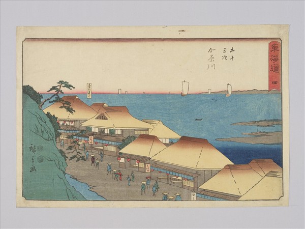 《東海道五十三次》是浮世繪三傑之一是歌川廣重作品,以東海道起點和終點加上五十三個宿場特色的風景為主題,共五十五幅版畫作品,後人評價較出色的版本分別是:「保永堂版」、「行書版」和「隸書版」。 本幅為江戶時代丸屋清次郎經營的「壽鶴堂」發行販賣的「隸書版」,描繪神奈川宿或稱加奈川(現神奈川縣橫濱市神奈川區)風景,畫面由右而左標示「東海道四」、「五十三次 加奈川」、副題「台の茶や」、畫面左下角「廣重画」。