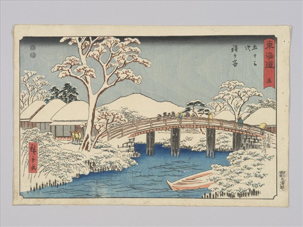 《東海道五十三次》是浮世繪三傑之一是歌川廣重作品,以東海道起點和終點加上五十三個宿場特色的風景為主題,共五十五幅版畫作品,後人評價較出色的版本分別是:「保永堂版」、「行書版」和「隸書版」。 本幅為江戶時代丸屋清次郎經營的「壽鶴堂」發行販賣的「隸書版」,描繪程谷宿(程ヶ谷宿,又名「保土谷宿」(保土ヶ谷宿),神奈川縣橫濱市保土谷區)風景,畫面由右而左標示「東海道五」、「五十三次 程ヶ谷」、畫面橋右下角副題「かたびら橋 かたびら川」、畫面左下角「廣重画」,畫面框外右下角「芝神明前 丸清板」印。