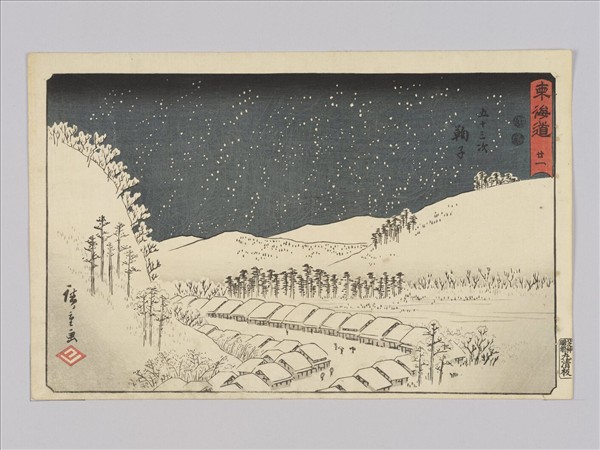 《東海道五十三次》是浮世繪三傑之一是歌川廣重作品,以東海道起點和終點加上五十三個宿場特色的風景為主題,共五十五幅版畫作品,後人評價較出色的版本分別是:「保永堂版」、「行書版」和「隸書版」。 本幅為江戶時代丸屋清次郎經營的「壽鶴堂」發行販賣的「隸書版」,描繪鞠子宿(靜岡縣靜岡市駿河區)風景,畫面由右而左標示「東海道二一」、「五十三次 鞠子」、畫面左下「廣重画」,畫面框外右下角「芝神明前 丸清板」印。