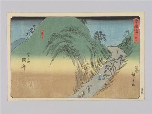 《東海道五十三次》是浮世繪三傑之一是歌川廣重作品,以東海道起點和終點加上五十三個宿場特色的風景為主題,共五十五幅版畫作品,後人評價較出色的版本分別是:「保永堂版」、「行書版」和「隸書版」。 本幅為江戶時代丸屋清次郎經營的「壽鶴堂」發行販賣的「隸書版」,描繪岡部宿(靜岡縣藤枝市)風景,畫面由右而左標示「東海道二二」、畫面右下「廣重画」、副題「宇津の山」、「五十三次 岡部」,畫面框外右下角「丸清板」。