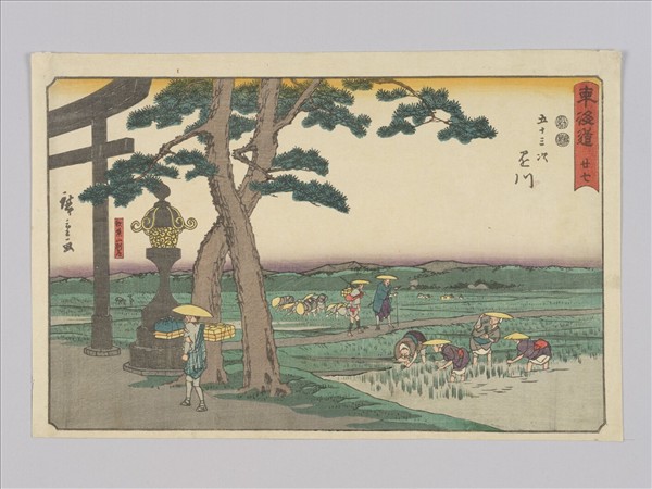 《東海道五十三次》是浮世繪三傑之一是歌川廣重作品,以東海道起點和終點加上五十三個宿場特色的風景為主題,共五十五幅版畫作品,後人評價較出色的版本分別是:「保永堂版」、「行書版」和「隸書版」。 本幅為江戶時代丸屋清次郎經營的「壽鶴堂」發行販賣的「隸書版」,描繪掛川宿(靜岡縣掛川市)風景,畫面由右而左標示「東海道二七」、「五十三次 懸川」、副標「秋葉山別道」、「廣重画」。