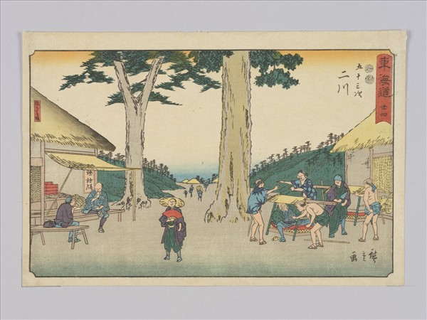 《東海道五十三次》是浮世繪三傑之一是歌川廣重作品,以東海道起點和終點加上五十三個宿場特色的風景為主題,共五十五幅版畫作品,後人評價較出色的版本分別是:「保永堂版」、「行書版」和「隸書版」。 本幅為江戶時代丸屋清次郎經營的「壽鶴堂」發行販賣的「隸書版」,描繪二川宿(愛知縣豐橋市)風景,畫面由右而左標示「東海道三四」、「五十三次 二川」、副題「猿ヶ馬場」、畫面右下橫式由右至左落款「廣重画」。