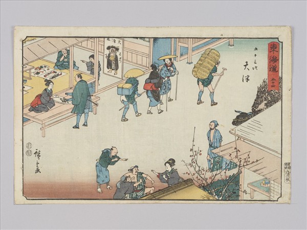 《東海道五十三次》是浮世繪三傑之一是歌川廣重作品,以東海道起點和終點加上五十三個宿場特色的風景為主題,共五十五幅版畫作品,後人評價較出色的版本分別是:「保永堂版」、「行書版」和「隸書版」。 本幅為江戶時代丸屋清次郎經營的「壽鶴堂」發行販賣的「隸書版」,描繪大津宿(滋賀縣大津市)風景,畫面由右而左標示「東海道五十四」、「五十三次 大津」、左下「廣重画」,畫面框外右下角「芝神明前 丸清板」印。