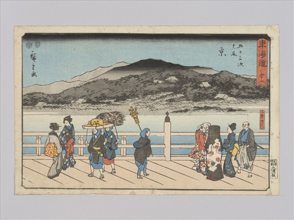 《東海道五十三次》是浮世繪三傑之一是歌川廣重作品,以東海道起點和終點加上五十三個宿場特色的風景為主題,共五十五幅版畫作品,後人評價較出色的版本分別是:「保永堂版」、「行書版」和「隸書版」。 本幅為江戶時代丸屋清次郎經營的「壽鶴堂」發行販賣的「隸書版」,描繪三條大橋(京都府京都市東山區)風景,畫面由右而左標示「東海道五十五」、「五十三次 大尾 京」、右下副題「三条大はし」、「廣重画」,畫面框外右下角「芝神明前 丸清板」印。