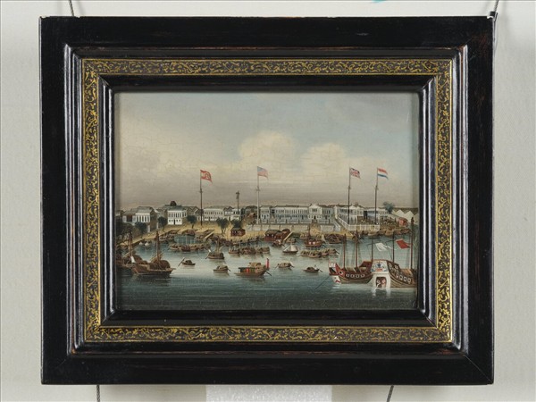 廣州地區的外銷畫,受到西方畫風之影響,不但具有地域性特色,又富於時代意義,充分顯示當時亞洲與歐洲之間的文化交流狀況。 本幅為廣州港景圖,描繪1822年大火前的十三行,館前旗幟由左至右分別為西班牙、美國、英國、荷蘭。此時美國商館剛好換上新正面,其左側的鍾鈴應該也立於同一年。