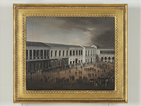 1807年2月24日,海王星號(Neptune)船員為報復前一天伊利侯爵號(MarquisofEly)在珠江沿岸被當地居民搶劫,襲擊沿岸居民,造成一位叫Leu A-ting(或Leao-a-teng,音譯廖阿騰)的村民死亡。4月28日舉行52名船員的公審,前景是坐著肩輿的官員與儀仗隊行經帝國行和瑞士行(黑色立面),然後進入門口有英國紅色軍裝軍人的老英國行。當時參與此次審判的洋行行商包括潘啟官(十三行的商總)、茂官(事主)、沛官Peiqua/浩官、混水官Conqeque;船長羅爾傑斯、George Thomas Staunton(Macartney的翻譯官)。