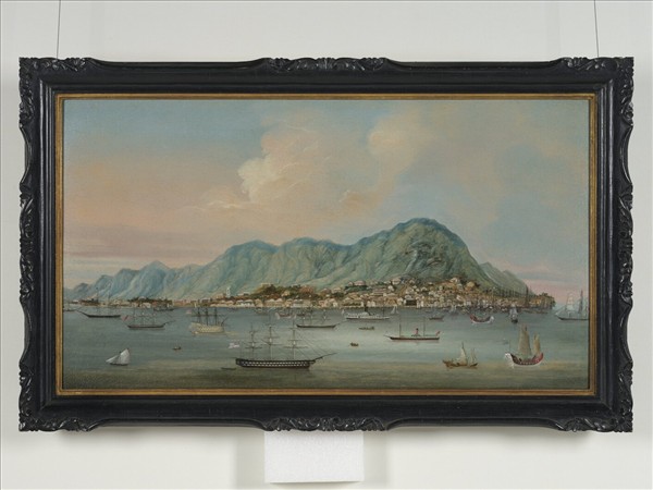 本幅描繪從九龍眺望香港島的風景,前景的海面上可見掛著美國及英國旗幟的蒸汽輪船,特別是左側一艘三層式的「回收船舶」(receiving ship)令人注目,而岸上所見灣仔及中環的建物亦成為吸睛焦點,幾棟著名的地標建築如聖約翰主教堂、P&O大樓清楚可見。