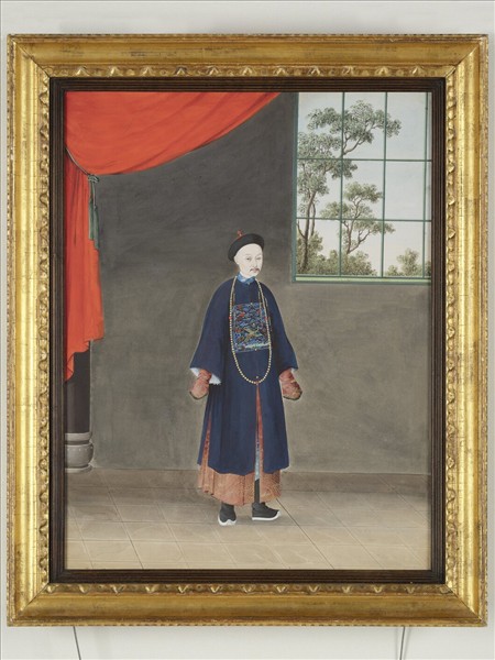 一位身著清朝官服的男子四分之三側立於畫幅中央,官帽上繪製紅色不透明頂珠(清朝二品官朝冠象徵),官服上補子繡有象徵二品文官的錦雞圖樣,男子左上角一大面的紅色布簾束縛於柱上,左側則是一大面的開窗,由此得以望見外面的樹林。上述人物二側分別飾以布簾及開窗的構圖,普遍流行於歐洲如荷蘭的肖像畫中,後來亦可見日本司馬江漢及廣州關作霖以此構圖表現人物畫。本幅構圖雖與當時畫作相仿,然其繪畫對象為中國官員,十分特別。
