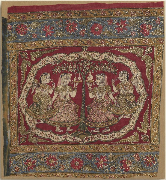 這塊華麗的棉質紅地繪染布(Kalamkari),是毗澈帷(Pichhwai)掛飾的局部,一般懸掛於與黑天信仰相關的儀式及慶典,描繪黑天的生平。黑天,是印度重要神祇─毗濕奴的化身,黑藍膚色是其特徵。神話中,成長於牧牛人家的黑天與牧牛女的愛情,常為印度文學吟唱。黑天於樹下吹笛,與尋聲而來的牧牛女們相會、共舞的歡愉場面,是經典的藝術母題。圖像上牧牛女們往往列於樹的兩側,面對花樹下的黑天,有時,花樹也作為黑天的象徵。